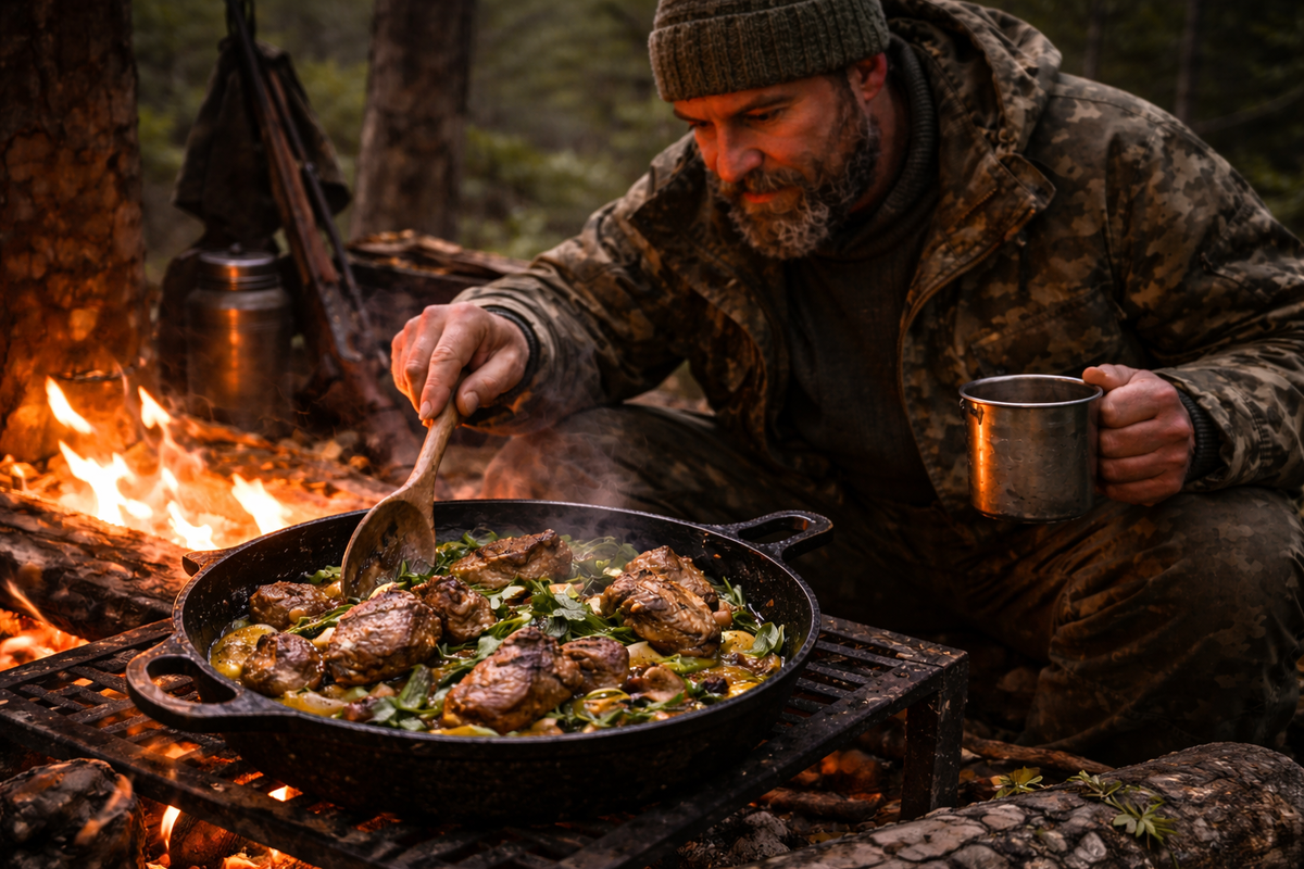 Охотничий ужин после долгой тропы: утка, жаренная на сковороде с луком и таёжными травами
