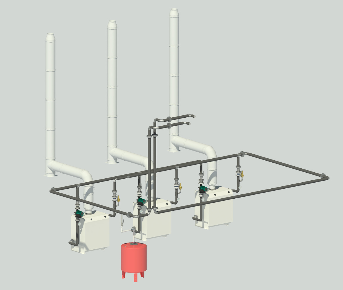 Мы проектируем не только частные дома. Вот пример проекта отопления производственного помещения. Высота помещения 13-17м, поэтому тепловентиляторы. Источники тепла - 3 газовых котла Лемакс Премиум 100 кВт. Тепловентиляторы BHP W2 40 S от BALLU подвешиваются на фермы кровли, поток воздуха вертикально вниз. Таким образом решается проблема подъёма тепла наверх, тепловентилятор срабатывает как дестратификатор. Котлы установлены в одну линию, подключение подающего и обратного трубопроводов спереди, а подключение газа сзади. Дымоходы заказчики решили выводить "в стену", хотя логичнее было бы "в крышу", видимо были свои резоны. На обратке каждого котла насос циркуляционный BASIC PRO 50-12SF 3x380В от Shinhoo, с одной стороны подходит по расходу/напору, с другой хорошо нарисовано семейство (.rfa). Гибкие вставки не дают насосу вибрировать. Предохранительный клапан регулируемый и обратный клапан на подаче. Термометры на обоих трубопроводах. Котельная обвязана электросварной трубой на фланцах.