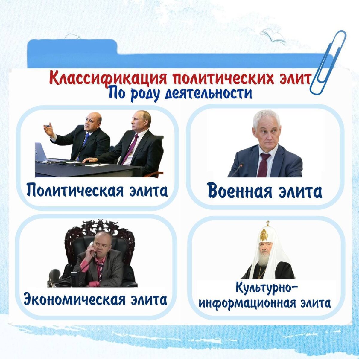 👇 Предлагаю разобрать одну из сложнейших тем для большинства учеников. Она из блока «Политика»👇 «Политическая элита» - тема, которую не очень любят ученики! Но если разобраться как следует, трудностей она не вызывает☝🏻 👥Политическая элита – особая группа людей, занимающая привилегированное положение, концентрирующая в своих руках значительный объем политической власти, занимая руководящие позиции в управлении обществом. 📚Обязательно изучите карточки с классификацией политических элит. Изучайте карточки и пересылайте одноклассникам! Пусть тоже учат👍 Мой резервный канал в мессенджере MAX #полезноеобщага