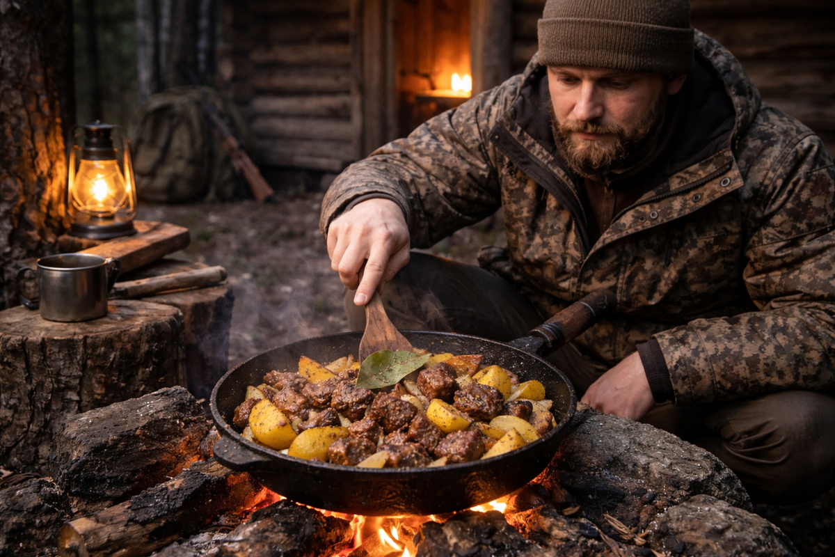 Охотник возвращается к зимовью уже в темноте. День выдался тяжёлый: глубокий снег, долгий переход по лесу и наконец удачная добыча — молодой кабан. В избушке холодно, но печь быстро разгорается, а рядом на столе появляется тяжёлая чугунная сковорода. В тайге долго не мудрят — самое правильное после такого дня приготовить простое, сытное жаркое из свежего мяса. Ингредиенты: