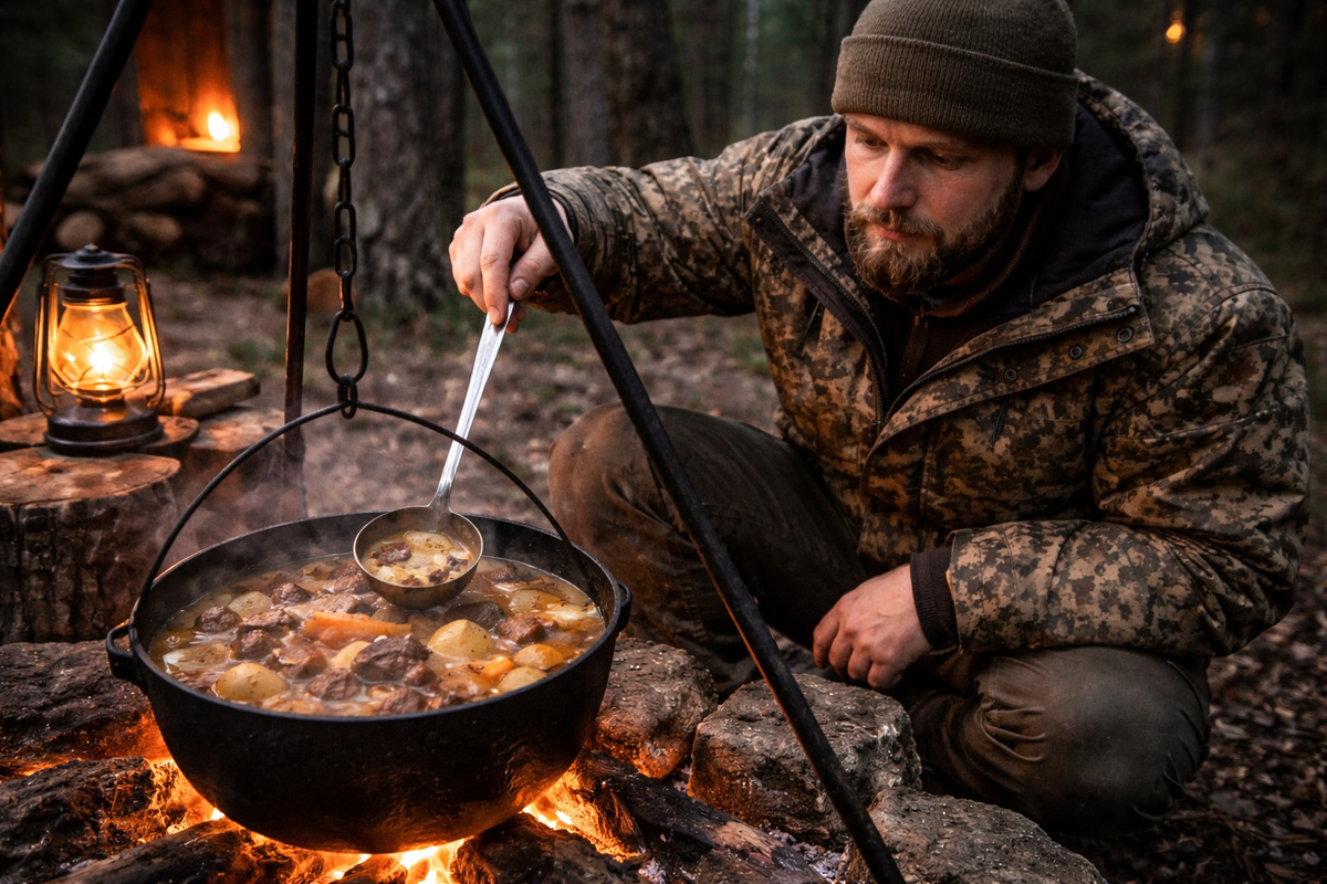 Охотник возвращается к стоянке уже под вечер. День прошёл в глухой тайге, и удача улыбнулась — в рюкзаке тяжёлый глухарь. В избушке или у костра долго думать не приходится: самая правильная еда после холодного дня — густой наваристый суп из дичи в котелке. Такой суп согревает, насыщает и пахнет настоящим лесом. Ингредиенты: