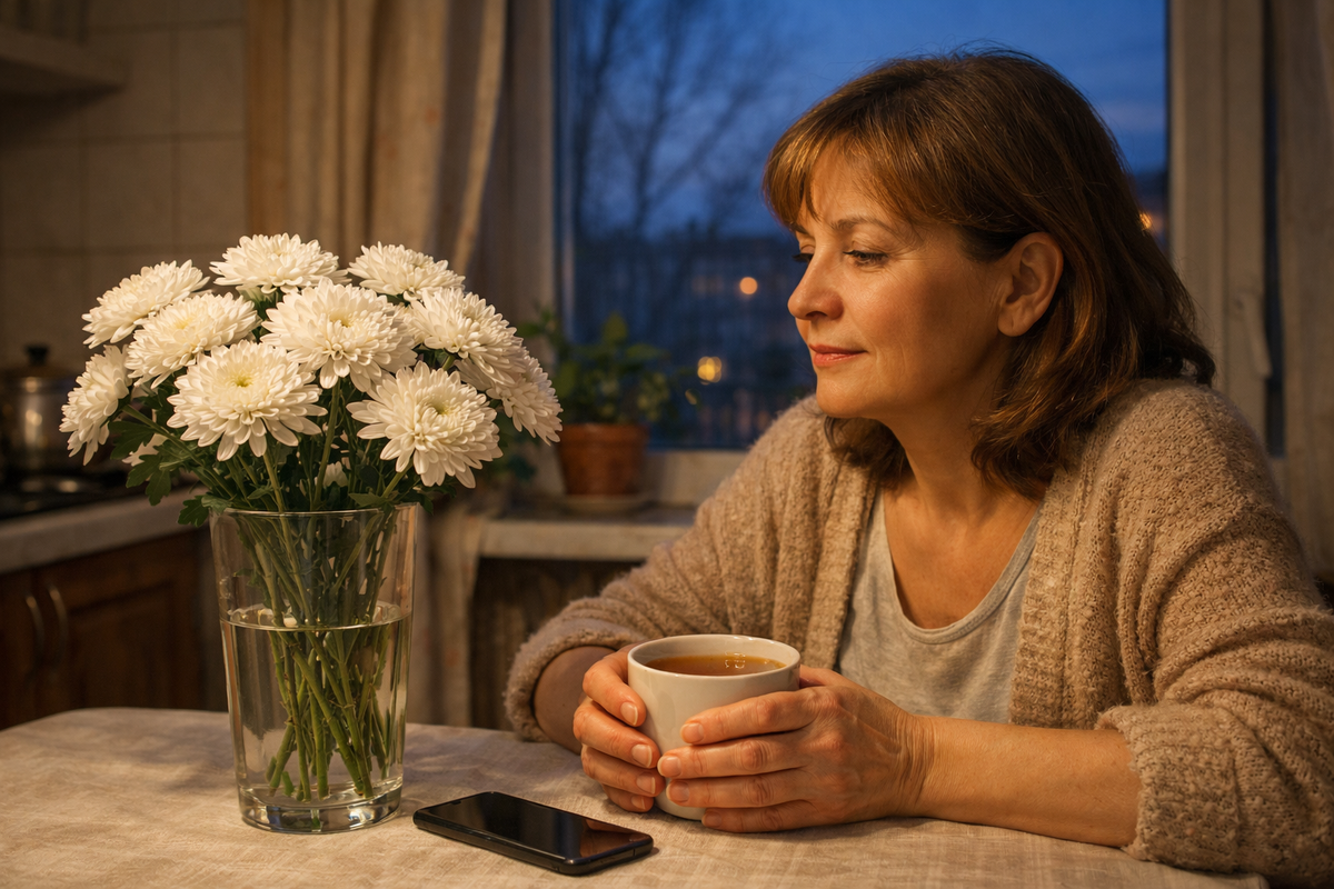 Мне было сорок девять лет. На столе стояли белые хризантемы от человека, которого я почти не ждала. Телефон молчал. За окном март наконец-то стал похож на весну.