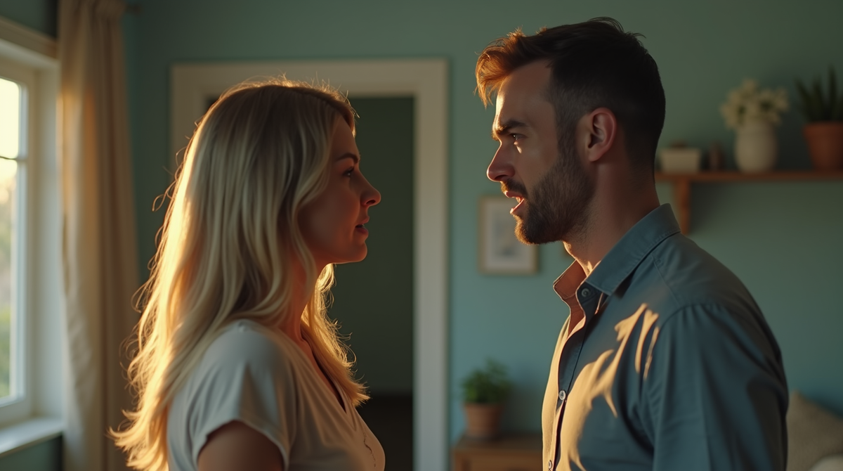Она замерла посреди кухни, всё ещё держа в руках кухонное полотенце, которым только что вытирала тарелки после ужина. Сердце заколотилось так сильно, что она почувствовала его удары в висках, а в горле мгновенно пересохло. Сергей стоял у окна, освещённый холодным светом уличного фонаря, проникавшим сквозь неплотно задёрнутые шторы. Его лицо, обычно такое спокойное и даже немного ленивое, теперь было искажено яростью, которой она раньше почти не видела за все двенадцать лет их брака.