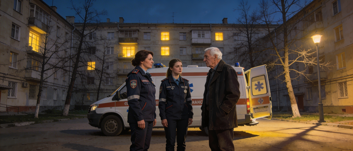 Фельдшер Нина посмотрела на часы, когда рация тихо треснула в машине скорой помощи. — Вызов. Пожилая женщина. Очень плохое состояние, — передал диспетчер. Водитель Владимир молча кивнул и аккуратно вырулил со станции. Рядом на сиденье сидела практикантка Валентина. Для неё каждая смена всё ещё была как отдельная история. Через несколько минут машина остановилась у старого пятиэтажного дома. У подъезда их уже ждал пожилой мужчина. Невысокий, худой, в старом пальто. Ему было лет восемьдесят, не меньше. — Спасибо, что приехали… — тихо сказал он. Нина уже собиралась подняться в квартиру, но мужчина вдруг остановил её. — Пожалуйста… ещё две минуты. Дайте мне закончить. Он говорил спокойно, но в голосе чувствовалась усталость многих лет. — Мы с ней вместе почти шестьдесят лет… Она давно болеет. Врачи сказали… рак поджелудочной железы. Он сделал паузу и опустил глаза. — Только она об этом не знает. Я прошу вас… не говорите ей. Нина тихо кивнула. — Конечно. Мы всё понимаем. Они поднялись в ква