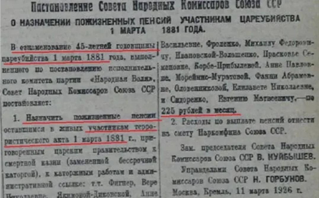 🇷🇺 14 марта 1926 — В СССР девяти бывшим участникам покушения на Александра II назначена персональная пенсия 💰 14 марта 1926 года в № 60 газеты «Известия ЦИК СССР и ВЦИК» было опубликовано постановление Совета Народных Комиссаров, датированное 11 марта . Этим документом девяти оставшимся в живых участникам убийства императора Александра II назначались пожизненные персональные пенсии. Решение было приурочено к 45-й годовщине событий 1 (13) марта 1881 года, когда бомба народовольца Игнатия Гриневицкого оборвала жизнь царя-освободителя . Так Советское государство официально отметило заслуги людей, чья молодость прошла в «царских застенках» за участие в самом громком политическом убийстве XIX века. ✍️ Основные факты · 🗓️ Даты решения и публикации: Постановление Совнаркома СССР было подписано в Кремле 11 марта 1926 года. Распубликовано (официально опубликовано) оно было в «Известиях» 14 марта 1926 года . · 👥 Количество и имена: Пенсии были назначены девяти человекам . Согласно текст