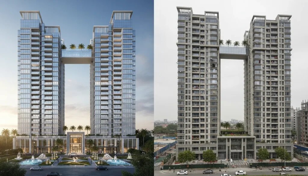 Главное отличие от рендеров даже не в самих башнях, а в том, что их окружает. Визуализации, как часто это бывает, показывают комплекс в идеализированном контексте. В реальности рядом находятся кладбище, загруженное шоссе и многоэтажные дома старого формата. Эти соседства существовали на момент проектирования и продаж, но на картинках их предпочли не акцентировать.