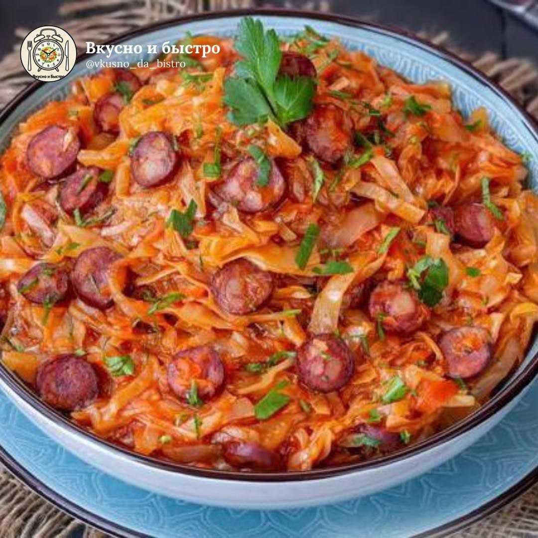 #обед #45мин 🕒 Время приготовления 45 мин Порции 4 Сложность: средне 🧾 Ингредиенты: 🟠Капуста — 1 шт. 🟠Охотничьи колбаски — 500 г 🟠Лук — 1 шт. 🟠Морковь — 1 шт. 🟠Протертые томаты — 3 ст. л. 🟠Лавровый лист — 2 шт. 🟠Соль, перец — по вкусу 🟠Вода — 100 мл 🍴Приготовление: 1. Нарежьте колбаски кружочками, лук — полукольцами, морковь натрите на крупной терке. Обжарьте лук и морковь почти до готовности, добавьте колбаски и жарьте всё вместе 5 минут. 2. К овощам и колбаскам добавьте воду и протертые томаты (или 2 ст. л. томатной пасты + 1 очищенный и мелко нарезанный помидор). 3. Добавьте лавровый лист, соль и перец. Тушите 10 минут. 4. Переложите овощи с колбасками в кастрюлю с толстым дном. Сверху выложите нарезанную капусту. Тушите под крышкой до полной готовности капусты, периодически помешивая. Вкусно и Быстро | Мы в Мах 📲