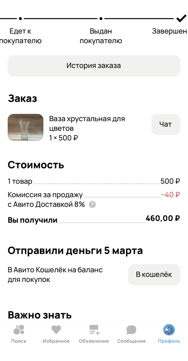 - Ваза хрустальная - 460 рублей. Знаю, что вазу можно было продать дороже, ранее я уже пыталась её продать, но безуспешно. Сейчас же, выложила перед 8 марта и снизила цену, заказ оформили буквально на следующий день. И очень хорошо, у меня как раз есть большое количество пупырки и упаковка. Заказали через пункт Авито.
