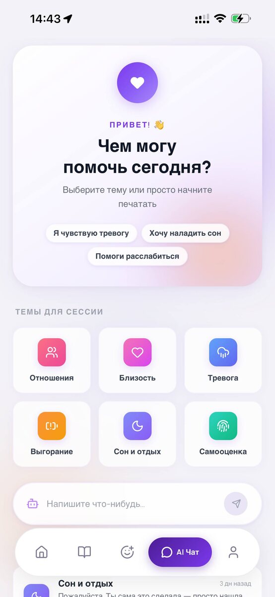 Почему мы сломали старую систему? Вы работаете с психологами, массажистами и курсами вслепую. У них нет реальных данных о том, что происходит с вашим телом 24/7. Все эти месяцы я искала способ, как дать вам "скорую помощь" не раз в неделю, а в ту самую секунду, когда вас накрывает. Как сделать так, чтобы мы перестали гадать и начали работать с фактами? И мы совершили революцию. Мы создали первую в России терапевтическую замкнутую систему. Мы объединили живых кураторов, мой 17-летний опыт и передовые технологии. Ее сердце это два инструмента, которые воедино дают результат в десятки раз быстрее и лучше, чем консервативные методы до этого. 1. Дневник эмоций Забудьте про тетрадки, в которые надо по часу выписывать слезы. Это умный трекер прямо в вашем телефоне. 30 секунд в день. Вы просто отмечаете, где зажало, что бесит, какой уровень тревоги. Впервые в жизни ваши эмоции будут оцифрованы. Через пару недель вы увидите свою личную тепловую карту. Вы своими глазами на графике ув
