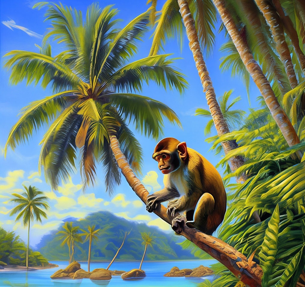 «Нет, не построить мне этой лодки…» думала мартышка, сидя под пальмой. Круглые глазки - как ягоды терна, Хотели узнать, что там за морской далью, Что за полоской, прячущей небо, Ночью, когда звёзды выходят из плена, Что за тем рифом, белым и жарким, Кто живёт в раковинке, пёстрой и яркой… Думала мартышка, стискивала пальцы- Коричневые пальчики, живые веточки- «Кто мне поможет, если сорвусь с пальмы? Кто поставит парус при сильном ветре?» Смотрела мартышка на крабов жемчужных В песке снующих и что-то жующих… Слезились глазки от блеска пены, Неслись по песку прозрачные тени… Плыла мартышка по синему морю. Плот из орехов лизали волны, Летучие рыбки прыгали в небо, Высокое небо, что морем полно! Плыла мартышка, а плотик качался, Вот уж и риф позади остался. Смеялась мартышка – за плотиком кто-то Маленький под водой гнался… Спала мартышка под пальмой. Уснула под шепот прибоя. Блеснула на солнце слезинка – И стала морскою водою… И лишь высокая пальма, Мартышкин сон охраняя, Бросала кокосами