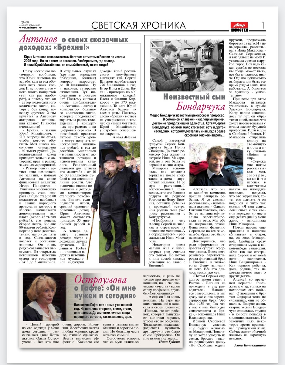 Моя публикация в газете "Мир новостей. Март 2026 г. (О сыне С. Бондарчука)