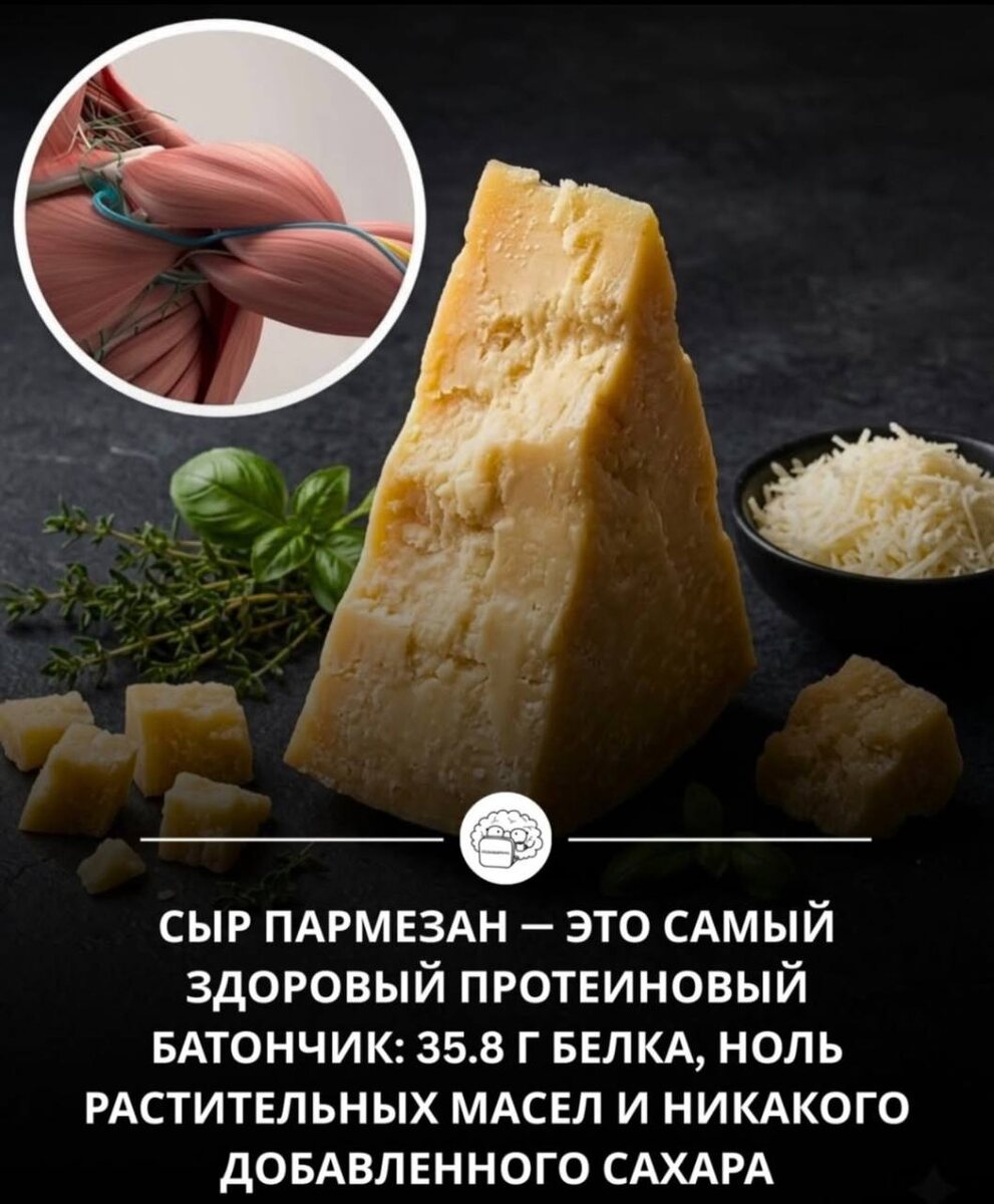 Пармезан иногда сравнивают с натуральным «протеиновым батончиком» из-за его необычно высокой плотности белка