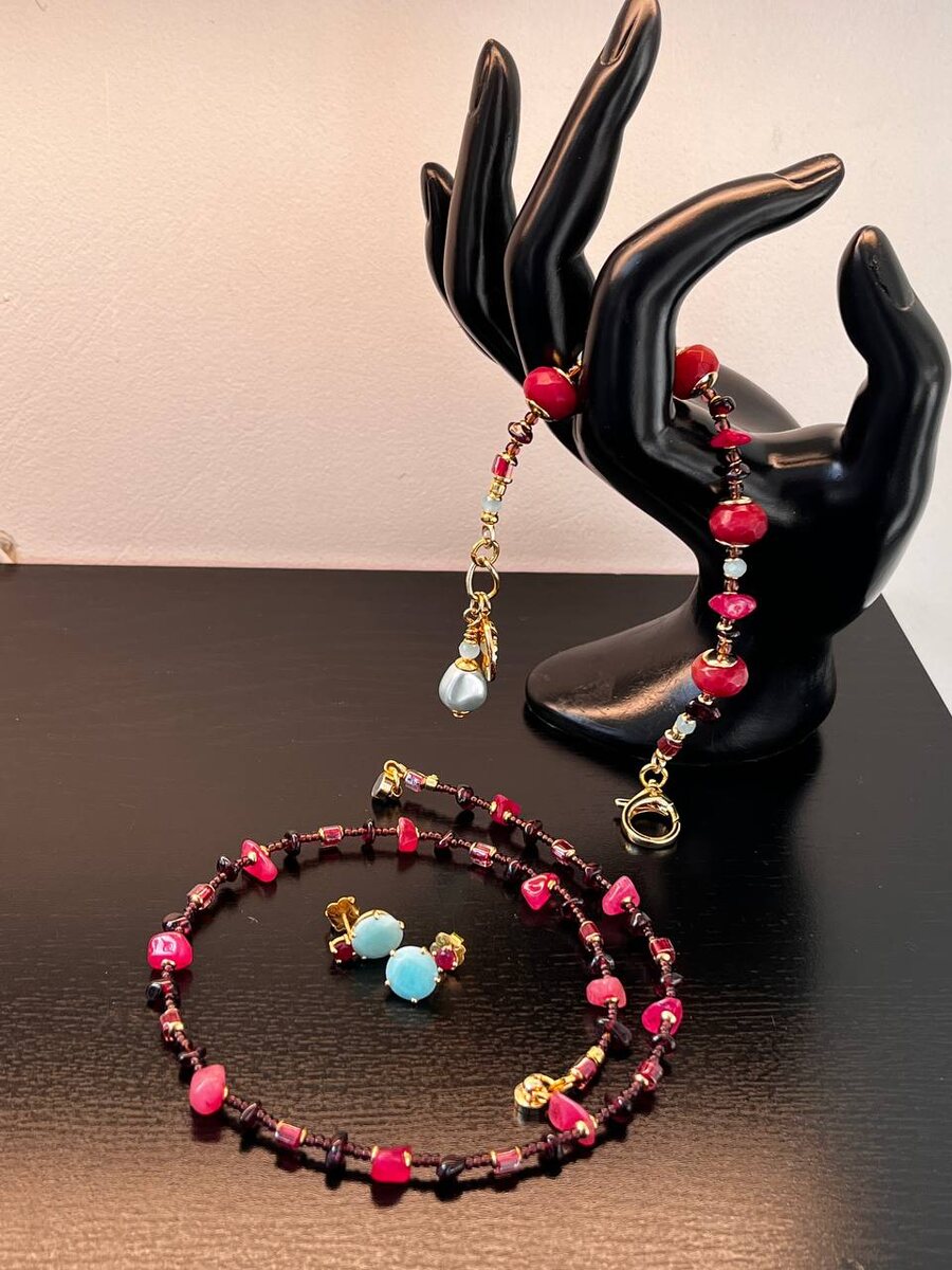 Миф или реальность. 😁 Одна прекрасная девушка купила у меня чокер. Ничего крупного в портретной зоне она не носила, а чокер из небольших сколов и галтовки граната и турмалина ей понравился и по цветовому решению и по размеру🌸 А потом она написала мне и попросила сделать браслет, только не прям вот как чокер, а как бы «по мотивам» и что бы он дружил с ее сережками из амазонита и рубина. А еще у нас с ней в разработке -переделке бусы, которые тоже надо иметь в виду😁( это уже я сама решила) В браслет добавила крупный природный рубин. И небольшие голубые бусинки из граненого стекла. Такие же будут в переделанных бусах. Очень красивое сочетание. Подвеска монетка и еще одна- собранная мной. И как-то повеяло восточным базаром, яркими шелковыми платками и коврами😍😍😍 Мне кажется, что у нас собралась капсула, что гораздо лучше и актуальнее, чем комплект. Девушка довольна, я довольна, осталось довести до ума голубые бусы))) to be continued…