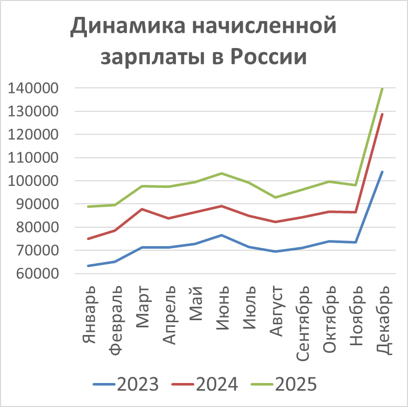 Телеграм канал HR-аналитики | НАШ КАНАЛ В VK В интернете завирусилась новость о «росте зарплат на 40%». Средняя зарплата в России в декабре 2025 г. выросла более чем на 40 000 руб. по сравнению с ноябрем. Если в ноябре показатель составлял 98 200 руб., то в декабре он достиг 139 700 руб. Над этим «повышением» уже успели знатно постебаться. Но в данном случае речь не о росте благосостояния. Речь о статистике. В декабре начисляются годовые премии, бонусы и 13-е зарплаты. Эти выплаты попадают в статистику именно в последний месяц года, поэтому каждый декабрь мы наблюдаем резкий скачок средней зарплаты. Если посмотреть динамику за несколько лет (см. диаграмму - данные Росстата о начисленной зарплате), картина повторяется: каждый год в декабре — рост. В январе - падение. Например, средняя начисленная зарплата декабря 2023 выше января 2025. Другой вопрос, что далеко не все работающие получают премии и 13-е зарплаты — и это тоже нормально. Но в некоторых организациях некоторым категориям сотр