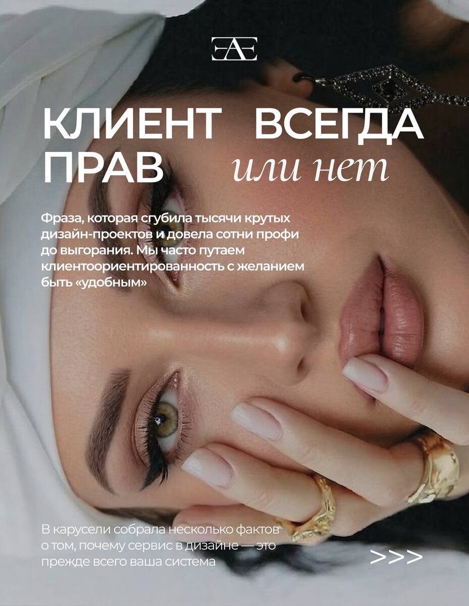 Мы часто путаем клиентоориентированность с желанием быть «удобным» Но вот парадокс: чем больше вы прогибаетесь, тем меньше вас ценят. Профессионализм начинается там, где заканчиваются оправдания и начинаются четкие алгоритмы коммуникации В карусели собрала несколько фактов о том, почему сервис в дизайне — это прежде всего ваша система Книга «Клиентоориентированность в дизайне» Это концентрат того, как перестать быть «руками» и стать стратегическим партнером, за которым стоят в очереди Посмотреть полное содержание книги и купить — здесь
