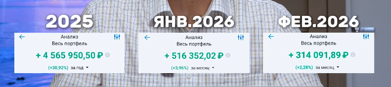 Остудить горячие головы, думающие, что они зайдут на трейдинг с депозитом в 100.000р и озолотятся. Первоисточник, смотреть на 22:50 Данные для анализа: 2025г - портфель 14М 766Тыр 980рупь 92копъ. Округляем до 14,8М. Январь 2026 - портфель 13М 039Тыр 192рупь 42копъ. Округляем до 13М. Февраль 2026 - портфель 13М 197Тыр 138рупь 24копъ. Округляем до 13.2М. Все нормальные люди считают доходность от начальной суммы. Надо понимать, что вычисленные величины публичного портфеля - это по состоянию на 1 января 2025, 1 января 2026 и 1 февраля 2026. Складывает начальный портфель 2025 года, прибавляем доход и вычитаем начальный портфель 2026 года. Получаем, что с публичного счёта было выведено 6М 293Т 738р. Аналогично для января 2026 получаем, что в пятницу 30 января 2026 с публичного счёта было выведено 358Т 406р. Но это не имеет значения для дальнейшего рассмотрения, чисто копание в чужих карманах из досужего любопытства. "С 1 января 2025 года в России действует прогрессивная шкала налога на доход