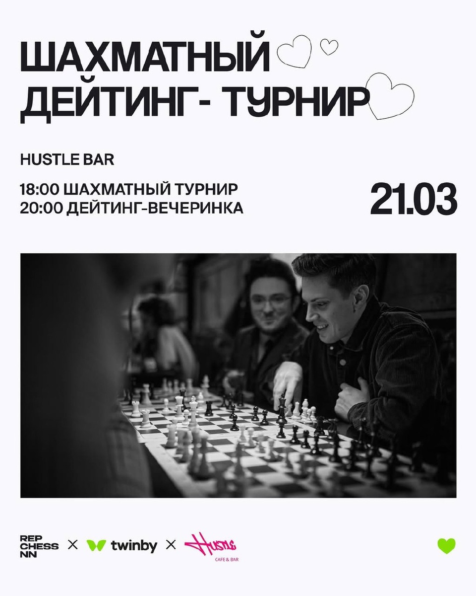 Будут двигать фигурки и общаться на всевозможные темы. После турнира — званый ужин с бургерами и картошкой фри. А для тех, кто любит танцевать — вечеринка до утра. 5 туров / 5+3 21.03 / 18:00 Почаинская, 17А, Нижний Новгород 😄 Мероприятия Нижний Новгород. Я местный! 📱 Telegram | 📲 MAX