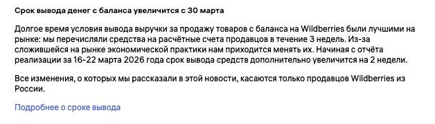 ” Wildberries заявил, что раньше условия вывода денег у них были лучшими на рынке, но из-за «сложившейся экономической практики» их пришлось изменить. Поэтому срок вывода увеличивается ещё на 2 недели. Здесь есть несколько вопросов. Во-первых, утверждение про «лучшие условия на рынке» мягко говоря спорное. Как минимум у Lamoda и Магнит Маркет сроки вывода денег для продавцов лучше. Во-вторых, что вообще означает «сложившаяся экономическая практика»? Если перевести на простой язык, получается примерно так: если у основного конкурента (например, Ozon) условия хуже — значит можно ухудшать и у себя. И дальше рынок начинает двигаться по спирали вниз. Хотя логично было бы ориентироваться наоборот — на лучшие практики рынка, когда изменения выгодны обеим сторонам. Пока же в этом нововведении сложно увидеть какую-то реальную необходимость. Кроме одной: попользоваться деньгами продавцов ещё две недели. Marketplace_biz - отдай свой буст каналу