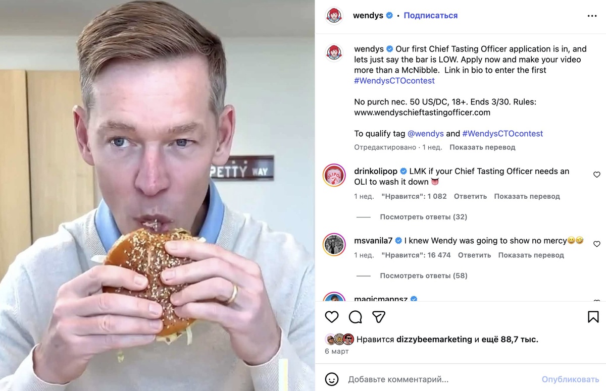 Крис Кемпчински, CEO McDonald's, снял видео, где пробует новый Big Arch бургер. Собрала для вас хайлайты: - Называл бургер "продуктом" - Откусил кусочек размером с горошину, как будто на него смотрит мама Хадид и кричит "ты уже съел целый миндаль, что ты делаешь?!" - Дважды заверил, что "точно доест на обед" - мы ему конечно не верим, в его террариум бургер не влезет - Выглядел так, будто пробует что-то на Fear Factor Видео взорвалось. Но не совсем так, как планировали в офисе, когда питчили это. Все решили прокатиться на волне успеха Криса, который, я повторяю, точно хорошо знаком с человеческой едой. Мои любимые реакты от конкурентов: - Burger King: Выпустил видео, где их президент откусывает огромный кусок Whopper. "Thought we'd replay this." - Wendy's: Показал, как их президент готовит Baconator и ест его целиком. Плюс шутка: "Наши машины для мороженого всегда работают" (удар по вечно сломанным машинам McDonald's) и предложили Крису работу - A&W: Прямая пародия. "Мы любим этот пр