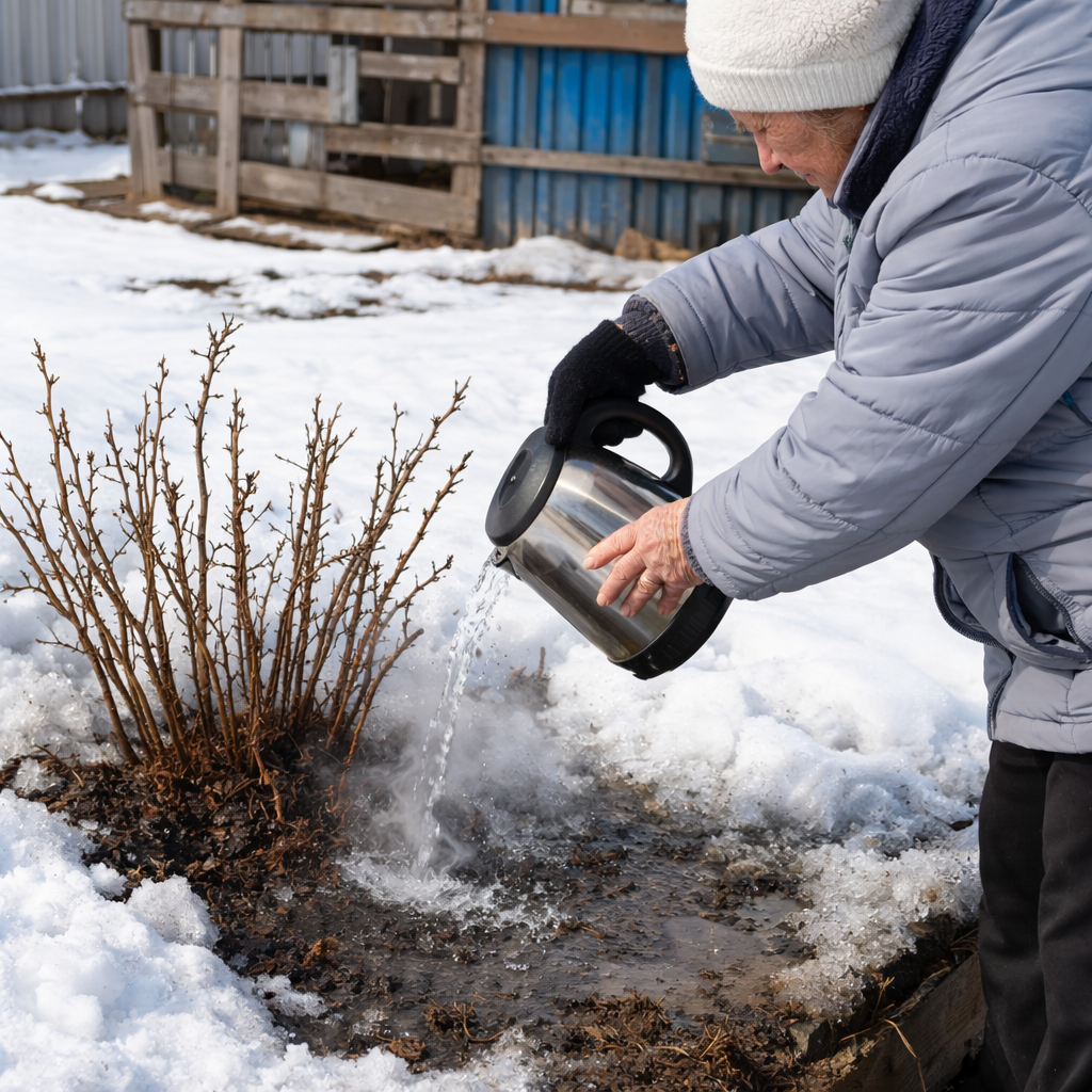 * Температура воды: Не используйте чистый кипяток прямо из чайника. Пока вы несете лейку до сада и наливаете воду, она остывает.