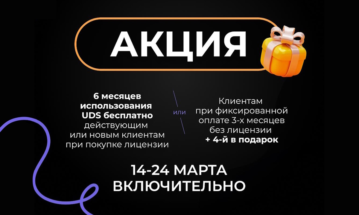 Мы заметили ваш интерес к платформе UDS Бизнес — и подготовили специальное предложение, чтобы вам было проще принять решение. С 14 по 24 марта 2026 года при покупке лицензии UDS вы получаете 6 месяцев абонентского обслуживания в подарок!