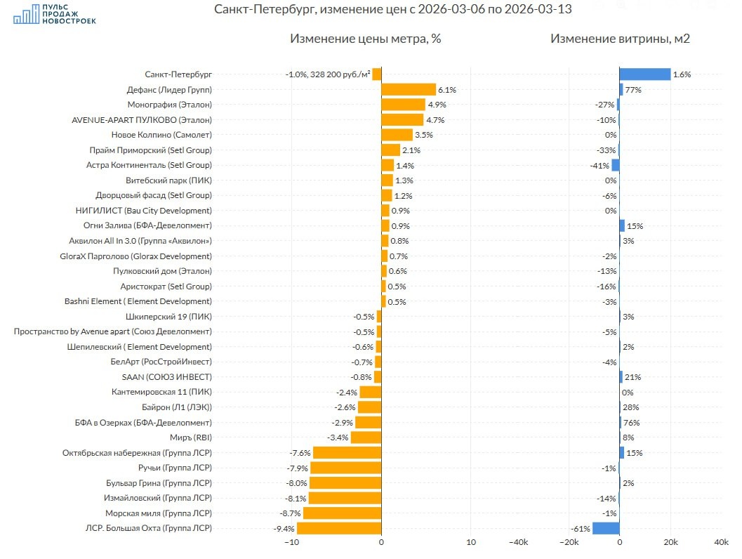 💰 Смотрим без премиум и элит классов. 💵 За 7 дней цена метра снизилась на -1.0% до 328 200 рублей за метр. 📈Топ изменения цен (подорожало): 1️⃣ ЖК "Дефанс" (Лидер Групп) цена метра +6.1%, объем витрины при этом увеличился на 1223м2 2️⃣ ЖК "Монография" (Эталон) цена метра +4.9%, витрина предложения уменьшилась на 1154м2 3️⃣ ЖК "AVENUE-APART ПУЛКОВО" (Эталон) цена метра +4.7%, витрина предложения уменьшилась на 536м2 🪫Анти топ (подешевело): 1️⃣ ЖК "ЛСР. Большая Охта" (Группа ЛСР) -9.4% в цене, витрина предложения уменьшилась на 10746м2 2️⃣ ЖК "Морская миля" (Группа ЛСР) -8.7% в цене, витрина предложения уменьшилась на 219м2 3️⃣ ЖК "Измайловский" (Группа ЛСР) -8.1% в цене, витрина предложения уменьшилась на 319м2 ☄️ Объем предложения жилья в регионе вырос на 1.6% (20048 м2) Все изменения в регионе на картинке. ‼️Только для наших подписчиков в телеграмм два сайта - сервис истории цен для поиска выгодных предложений и аналитики по проектам ПИК - рейтинг продаж ЖК с историей 🔥