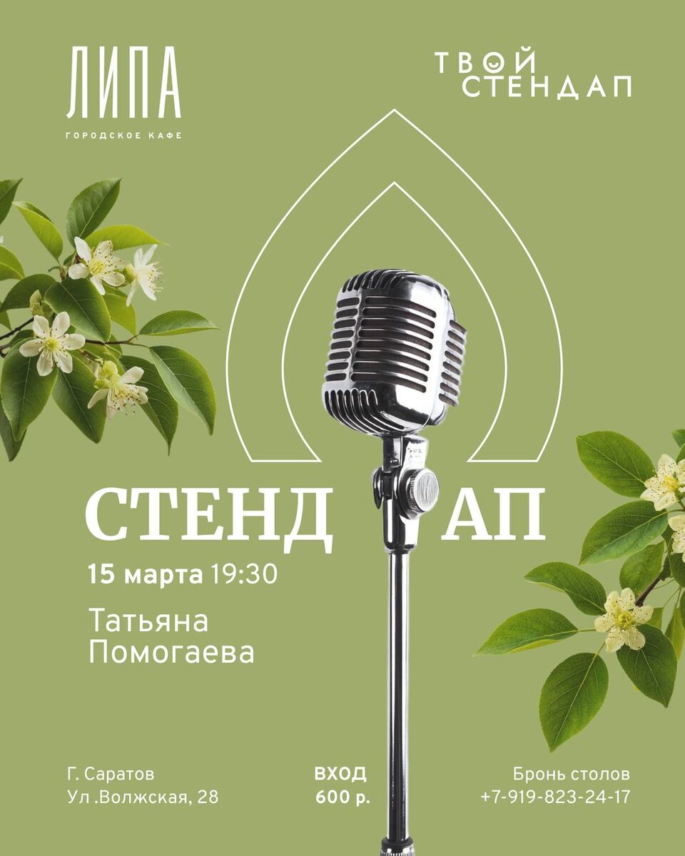» 🎤✨ 15 марта приглашаем вас на большой стендап-вечер в наше городское кафе. Это идеальный способ завершить неделю: в приятной компании, с любимыми блюдами и порцией первоклассного юмора. На сцене — опытные комики Саратова и Энгельса со своими лучшими монологами. ⭐ Хедлайнер вечера — Татьяна Помогаева 🗓 Когда: 15 марта (воскресенье) 🕖 Старт: 19:30 📍 Где: городское кафе «Липа», ул. Волжская, 28 🎟 Вход: 600 ₽ Проведите вечер ярко, смейтесь до слез и наслаждайтесь моментом в «Липе». 📞 Резерв столиков по телефону: +7-919-823-24-17