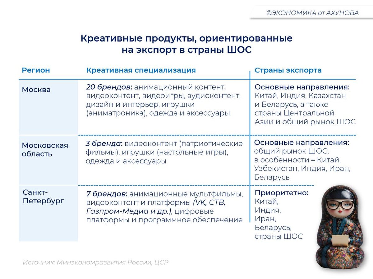 Как отмечал ранее, тема креативных индустрий имеет нераскрытый потенциал для развития в субъектах Российской Федерации. Регионы выстраивают стратегии развития сектора, основанные на уникальных локальных особенностях и креативных специализациях. Региональное распределение креативной экономики страны показывает значительный вклад Москвы. В тоже время интересные примеры имеются и в других субъектах РФ. Сегодня хочу познакомить подписчиков с лучшими примерами креативных продуктов, производимых в регионах России. Министерство экономического развития Российской Федерации и ЦСР представили «Сборник креативных продуктов России, ориентированных на экспорт в страны ШОС». Для знакомства с успешными примерами производства креативных продуктов подготовили для Вас, уважаемые подписчики, их обзор в региональном разрезе с выделением креативной специализации региона и потенциального рынка сбыта для экспорта (см. рисунки ниже). Источник: Министерство экономического развития РФ; ЦСР. 📑 Экономика от Аху