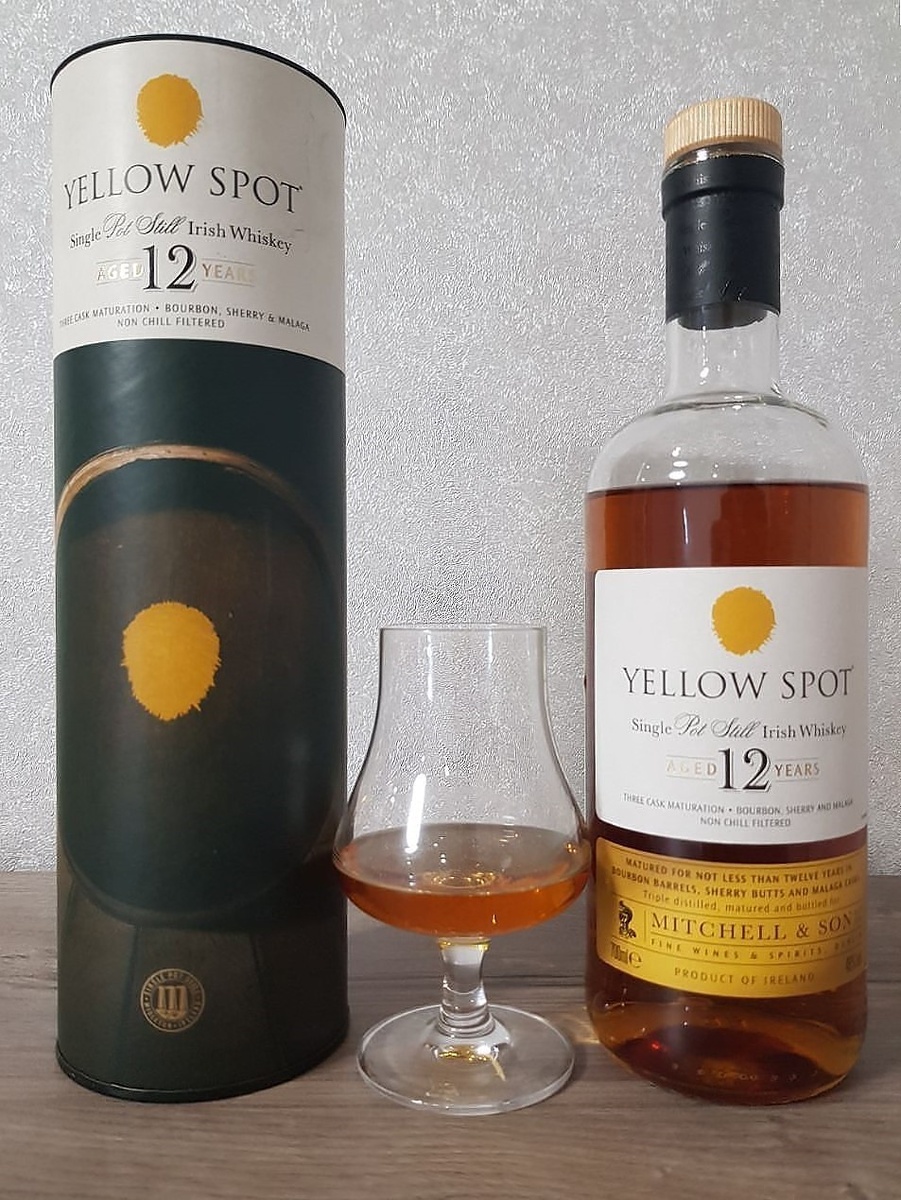 Виски в стиле Irish Pot Still, в нашем случае Single Pot Still. Произведен на винокурне Midleton Distillery в графстве Корк компанией Mitchell & Son. В линейке "Спотов", кроме Yellow, есть Green, Blue, Red, Gold - разной крепости, возраста и бочек для созревания. Дистиллерия Мидлтон также производит знаменитые Сингл Пот Стилл виски Powers John's Lane и Redbreast, принадлежащие компании Irish Distillers Limited. Кроме того, винокурня выпускает марки Jameson, Method and Madness и, в частности, Midleton Very Rare. Это третий релиз из анонсированной четвёрки Пот Стиллов, где кратко рассказано об особенностях производства Irish Pot Still Whiskey. Йелоу Спот 12 выгнан методом тройной дистилляции на традиционных медных кубах из соложёного и несоложёного ячменного сусла, выдержан в экс-бурбонных, экс-хересных бочках и бочках из-под испанского ликёрного вина Малага, в составе которого тоже "хересные", причём очень сладкие, сорта винограда - Педро Хименес и Москатель. Москатель к тому же мускат