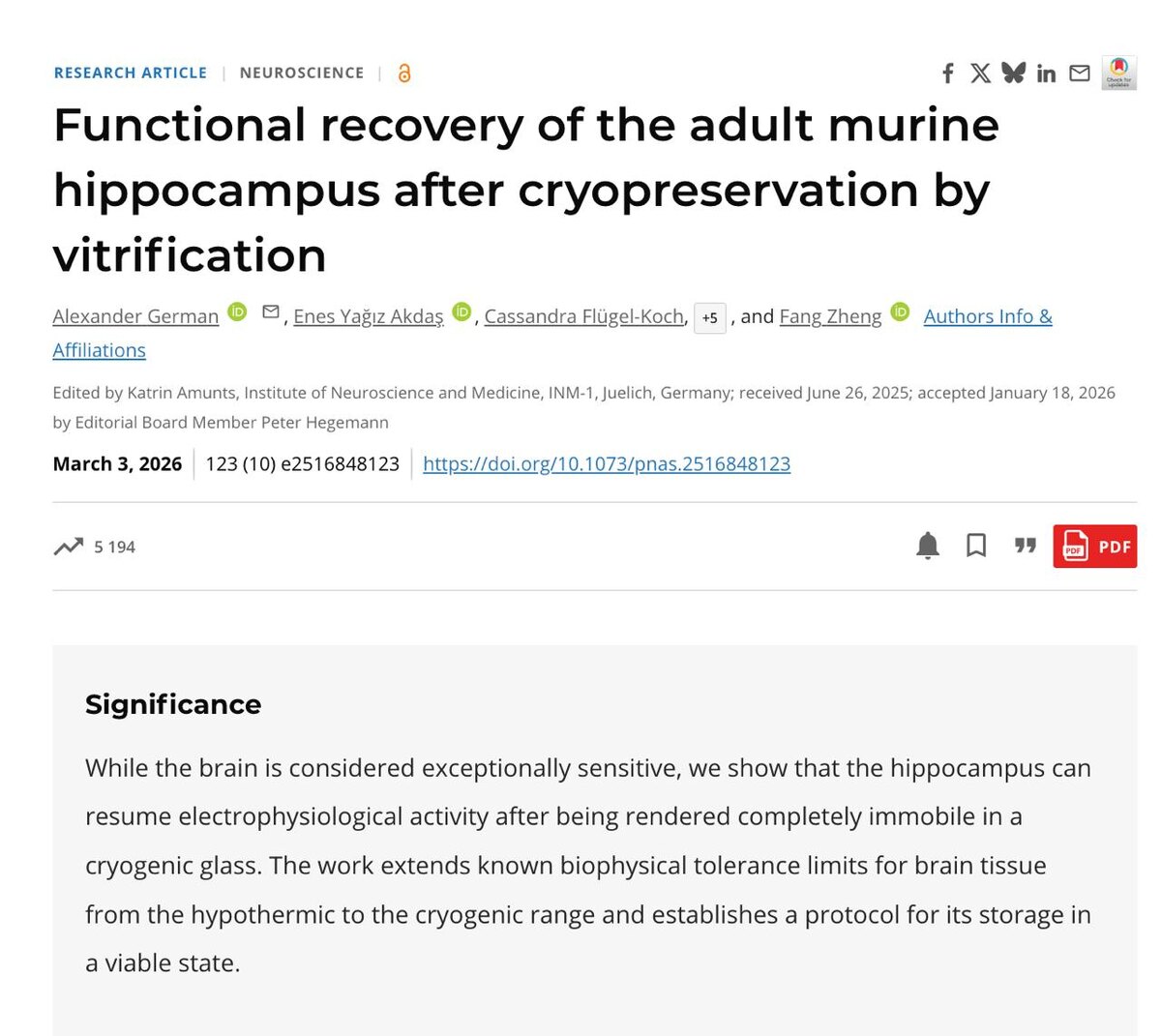 Сюжет из Футурамы, но теперь это реальность: немецкие учёные охладили гиппокамп (играет важную роль в хранении информации) мыши до -130 °C. Для этого они оптимизировали состав криопротектантов и процесс охлаждения. В результате нервная ткань осталась целой. После разморозки в гиппокампе снова появились электрические сигналы, которые распространялись по нейронным сетям. @lobushkin