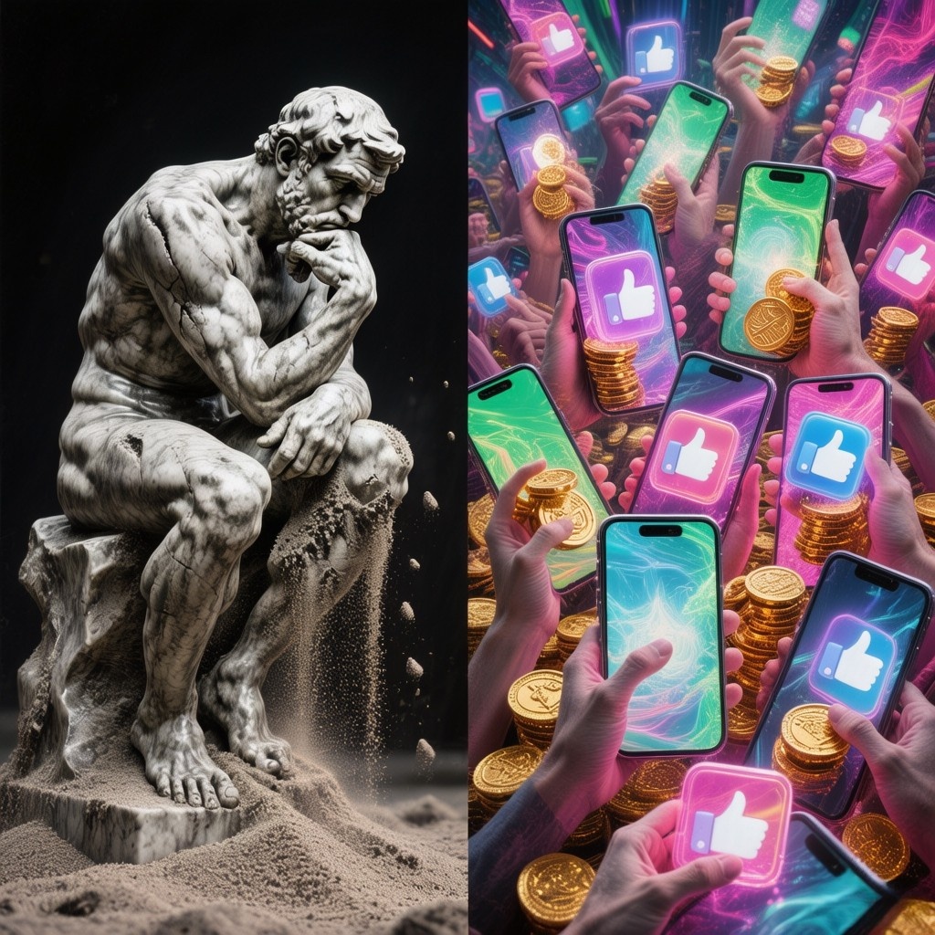 Иногда кажется, что мир вокруг стремительно теряет глубину. Мы наблюдаем, как поверхностный контент набирает миллионы просмотров, а сложные идеи остаются за бортом общественного внимания. Социальные сети пестрят видео, где смысл измеряется количеством лайков, а не качеством мысли. Многие блогеры становятся кумирами, не обладая никакими реальными знаниями, но умея эффектно подать себя. Возникает закономерный вопрос: в какой момент человечество начало терять интеллектуальные ориентиры? Конечно, каждое поколение склонно критиковать молодёжь, но сегодняшние изменения выглядят системными. Ещё Фёдор Достоевский устами Ивана Карамазова заметил: «Если Бога нет, то всё дозволено». Когда исчезают высшие смыслы, их место занимают сиюминутные удовольствия и культ потребления. Сегодня эту функцию во многом взяли на себя цифровые платформы, формирующие новый тип сознания. Разбираемся, как так вышло, что значительная часть общества, вооружённая самыми передовыми технологиями, всё чаще демонстрирует к
