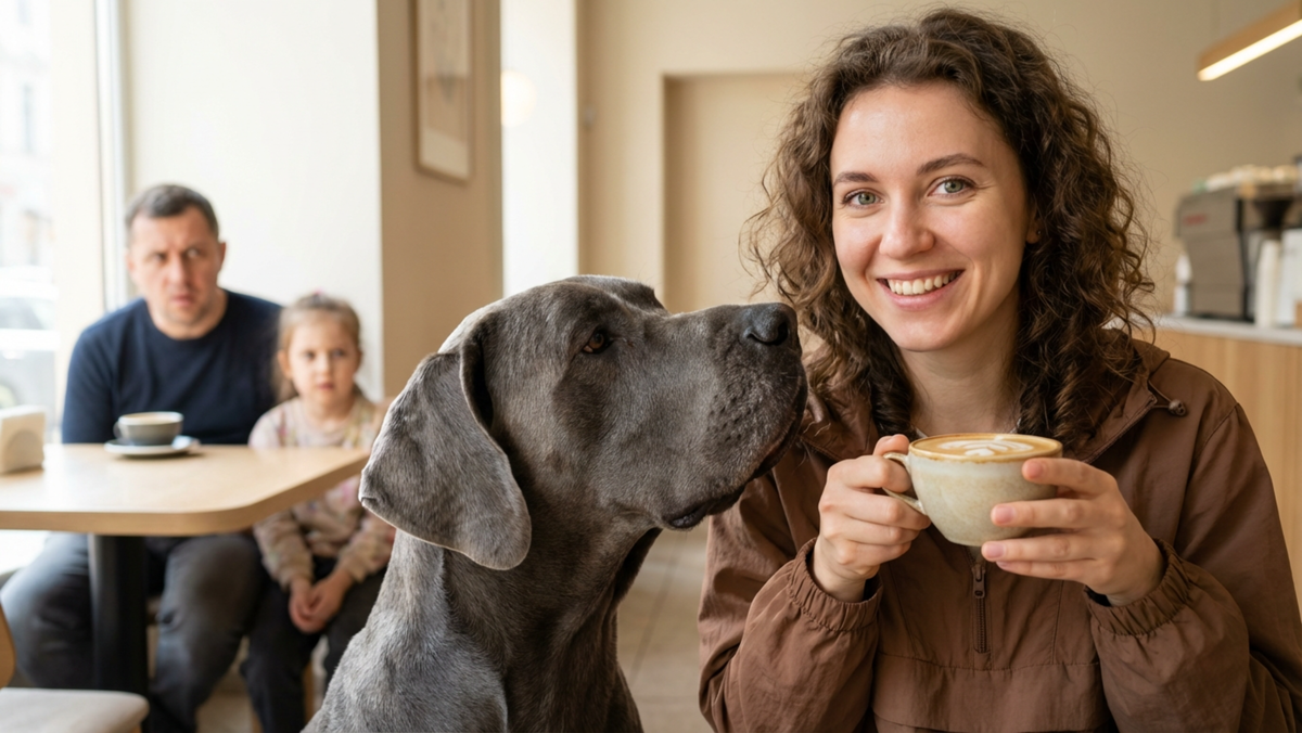 Немецкий дог растянулся у стойки, пока его хозяйка допивает латте. Администратор нервно поглядывает на соседние столики, где пара с ребёнком уже минут пять косится на животное. Сцена из модного московского кафе, где такие визиты стали обыденностью. Но стоит выехать за МКАД — и картинка меняется кардинально.