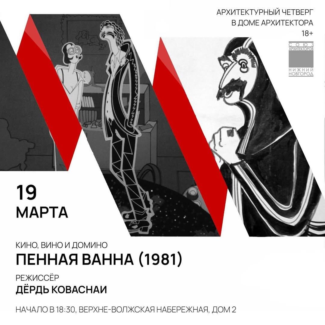 🛁 В четверг, 19 марта музыкальный анимационный фильм Дёрдя Коваснаи «ПЕННАЯ ВАННА»! Весна — самое время чуть-чуть сойти с ума и посмотреть на мир под непривычным углом, а поможет нам в этом самобытный венгерский мультипликатор (по совместительству художник, философ и драматург). Вас ждёт чрезвычайно модернистская как в визуальном, так и в сюжетном плане история о Жолте, сорокалетнем декораторе интерьеров, который в день своей свадьбы внезапно понимает, что совсем не хочет жениться... Фильм будет демонстрироваться на языке оригинала с русскими субтитрами. ❗️Вход свободный. Необходима предварительная регистрация❗️ Ссылка на регистрацию на сайте Дома Архитектора. Верхне-Волжская набережная, дом 2 😄 Мероприятия Нижний Новгород. Я местный! 📱 Telegram | 📲 MAX
