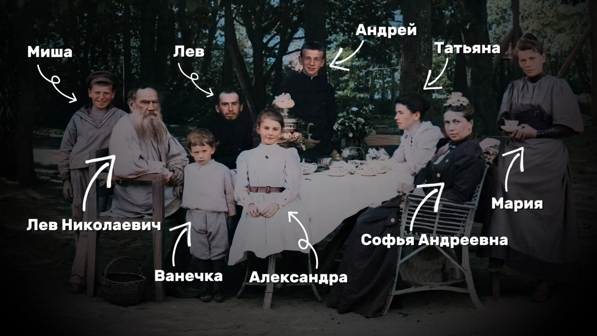 Все дети Толстого, дожившие до зрелого возраста, были очень яркими и непохожими друг на друга людьми. Дочери — Татьяна, Мария, Александра — были абсолютно преданы отцу и даже служили его первыми секретарями. Они переписывали за отца, вели его обширную переписку со всем миром, помогали. Уже только в конце жизни у Толстого появились наёмные секретари — Николай Николаевич Гусев и Валентин Федорович Булгаков. Отношения с отцом у сыновей — Сергея, Ильи, Льва, Андрея и Михаила — были сложные. Особенно у Льва Львовича, который был очень талантливым писателем. Его талант признавал сам Бунин. Только вот незадача — его имя Лев. Как ему подписывать свои произведения? «Лев Толстой — младший» — решил он. Но, конечно, его талант мерк на фоне гения отца, что его мучило всю жизнь и не могло не сказаться на отношениях с отцом. После революции все дети, за исключением Сергея, оказались за границей. Его самую младшую дочь — Александру — два раза арестовывали, а вытаскивал её ученик и самый преданн