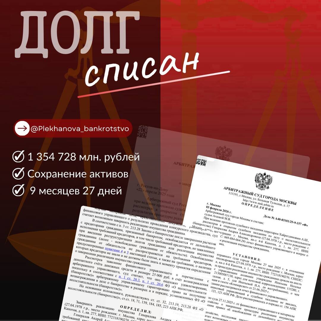 🙌🏼Жизнь на паузе, или Как вернуть будущее большой семьи История одного освобождения: –1 354 728 ₽ долга. Когда у тебя трое детей, ты не просто живешь — ты строишь фундамент для их будущего. Но что делать, когда этот фундамент начинает уходить из-под ног? 👉🏻Ситуация на старте: — Трое детей, которых нужно собирать в школу и кормить. —Долг более 1 000 000 ₽, который рос как снежный ком из-за штрафов. —Постоянное давление и страх за завтрашний день. 👉🏻Что мы сделали: Мы взяли эту нагрузку на себя. Пока наш клиент занимался поиском новой работы и проводил время с семьей, моя команда вела бой в правовом поле. Мы доказали: человек не «уклонист», а добросовестный гражданин, попавший в тяжелую жизненную ситуацию. 🏆Итог: Арбитражный суд вынес решение — полное списание долга.