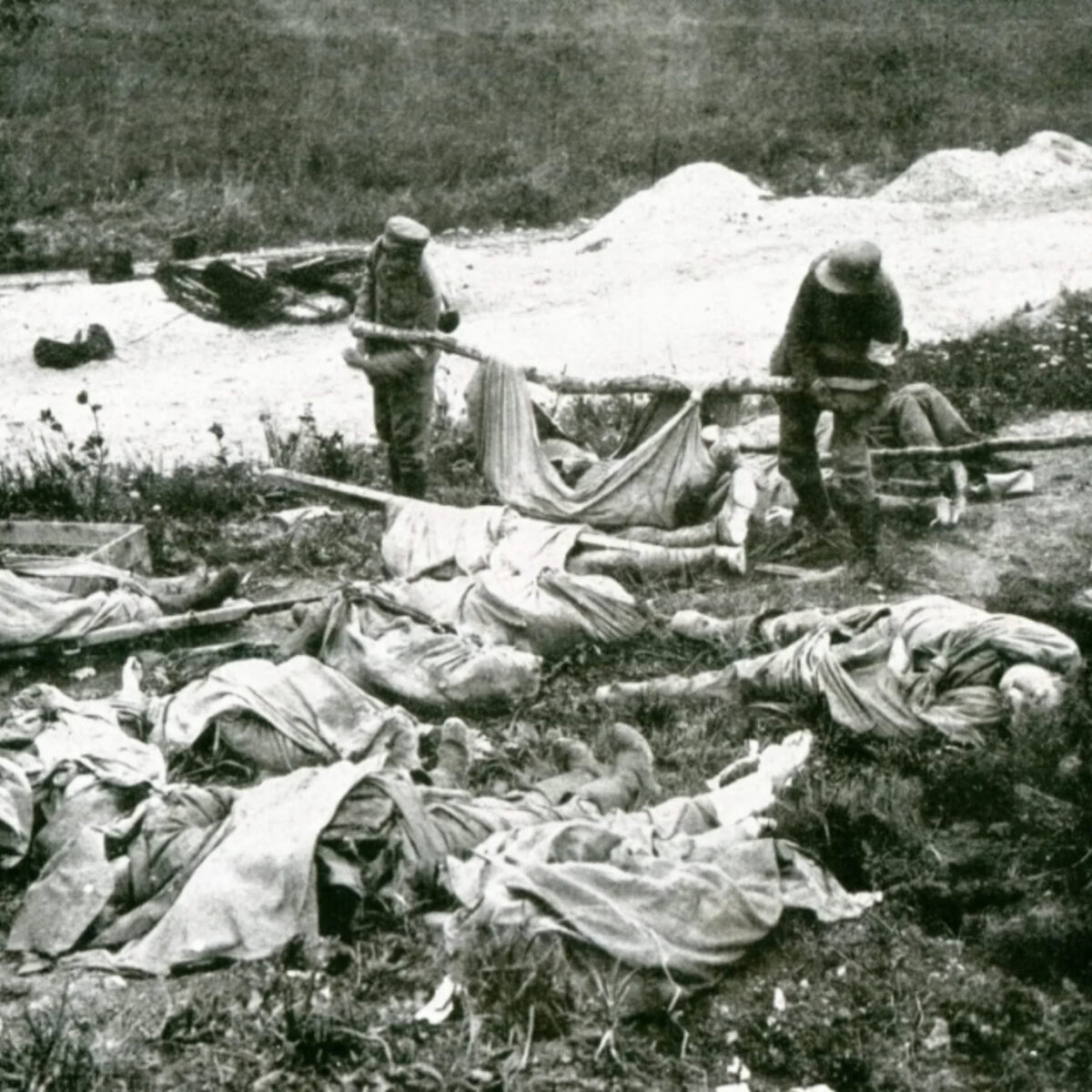 Германские медики собирают тела павших товарищей после Первой битвы при Камбре, примерно декабрь 1917 года