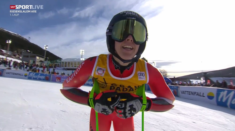 Штефани Гроб из Швейцарии впервые квалифицировалась во вторую попытку в гигантском слаломе. Она очень удачно выступила на этапе в Валь ди Фассе, заехав на 10-е место в супергиганте. Сегодня она прошла во вторую попытку с далеким 46-м номером. Штефи идет на лучшее время наверху, везет 24 сотых перед последним отрезком, но все же проигрывает 7 сотых Софи Ниберг – швейцарка вторая. Но все равно неплохо, будут очки Кубка мира в гиганте.