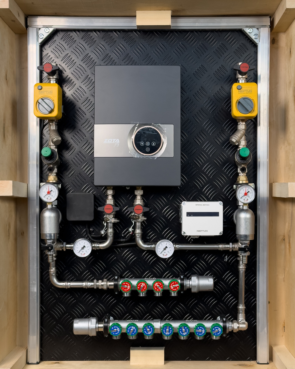 Когда люди слышат цену готового узла водоснабжения, часто кажется, что это обязательно должна быть очень дорогая система. Но на практике существует и другая категория — бюджетные, но полностью функциональные решения. Этот узел как раз из такой категории. Его стоимость — 226 439 ₽, а внутри находится 223 отдельных элемента инженерии: фитинги, краны, фильтры, соединения, датчики и оборудование. И несмотря на более доступную цену, здесь сохранён весь базовый функционал современной квартиры. Первое, что бросается в глаза — аккуратная и симметричная компоновка. Узел построен по классической схеме: При этом здесь нет избыточных элементов, которые увеличивают стоимость, но редко используются в обычных квартирах. Это хороший пример того, как можно собрать доступную инженерную систему без потери функциональности. Один из ключевых элементов узла — проточный водонагреватель ZOTA Joy 9 стоимостью 23 990 ₽. Это российский производитель, который давно работает на рынке отопительного оборудования и х