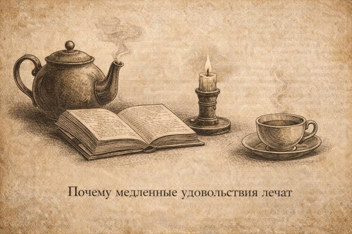 ? В современной среде быстрых стимулов мозг привыкает к мгновенному вознаграждению. Чем чаще удовольствие приходит быстро и без усилий, тем слабее мозг реагирует на более медленные и естественные источники удовлетворения. Именно поэтому медленные удовольствия оказываются терапевтически значимыми. Что это такое? 🔍Это процессы, в которых эффект развивается постепенно: прогулка, чтение, музыка, живое общение, ручной труд, приготовление еды. Они не дают резкого «пика», но запускают более сложные и устойчивые механизмы регуляции. 📎Например, обычная прогулка снижает уровень кортизола, уменьшает симпатическое напряжение, активирует парасимпатическую нервную систему, улучшает регуляцию дофаминовых и серотониновых путей, а также помогает мозгу восстановить чувствительность к естественным стимулам. То же происходит и с другими медленными удовольствиями. Они не «бьют» по системе вознаграждения коротким импульсом, а мягко возвращают ей нормальный ритм работы. ☕При зависимостях, тревожных