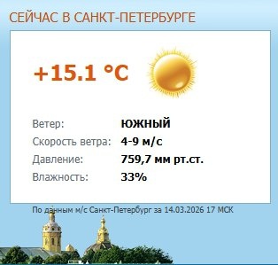 К 16:30 на опорной метеостанции Петербурга была полноценно преодолена 15°С-ная отметка — воздух прогрелся до +15,1°С! Сегодняшние +15 стали самыми ранними в истории петербургских мартов и занимают почетное 4 место в рейтинге самых теплых мартовских дней за всю метеорологическую историю города, уступая лишь: - 17 марта 2015 года (+15,3°С), - 29 марта 2025 года (+15,4°С), - 30 марта 2025 года (+16,1°С). Итоговый максимум узнаем после 9 вечера! 👉 Подпишись на https://dzen.ru/id/620a5b88892e660632b9887a