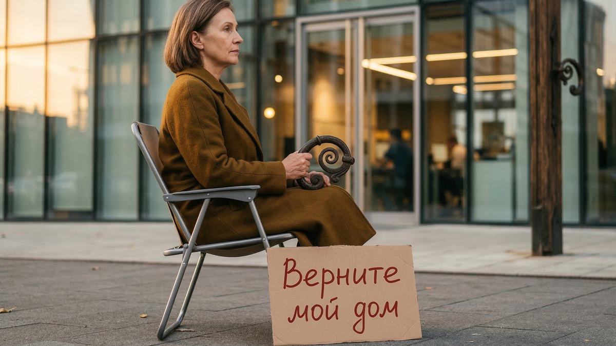 Каждое утро она приходила к половине девятого. Садилась на складной стул напротив стеклянных дверей офиса «Авангард-Строй», ставила на колени тяжёлую чугунную ручку – с завитком, потемневшую от времени, размером с ладонь взрослого мужчины – и молча смотрела на входящих. От тротуара тянуло бензином и прогретым асфальтом. Где-то за углом гудела стройка, и мелкая пыль оседала на её картонном плакате: «Верните мой дом». Буквы ровные, библиотекарские, написаны красным фломастером.