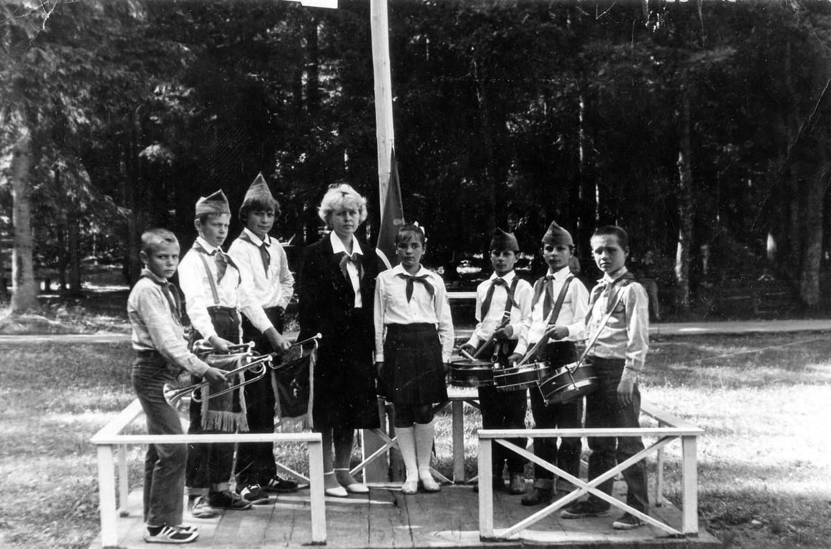 Барабанщики и горнисты пионерского отряда со старшим пионервожатым и звеньевой у пионерского флага.