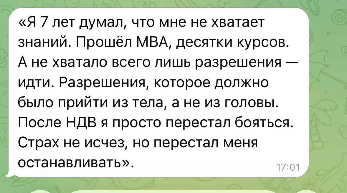 После 3 сессий НДВ запустил за 3 недели» Клиент: Михаил, 45 лет, топ-менеджер в найме (зарплата высокая, но внутри — выгорание). Запрос: «Я хочу уйти в своё дело. У меня готовая бизнес-модель, просчитаны риски, есть подушка безопасности. Но я не могу начать. 7 лет я "готовлюсь". Каждый год говорю себе: "Вот сейчас, осталось доделать последнее". И ничего не происходит. Начинаю — бросаю. Берусь — откладываю». Что обнаружилось на консультации: Михаил — классический «вечный студент». Много курсов, много книг, много планов. Но как только доходит до реального действия — тело встаёт в ступор, появляются срочные дела, усталость, «надо ещё подумать». В теле — зажатость в тазовой диафрагме и пояснице. Это зона, отвечающая за движение вперёд. При разговоре об отце — Михаил на секунду замер, потом продолжил как ни в чём не бывало. Вернулись к этой теме. Выяснилось: отец Михаила был успешным предпринимателем, но в 90-е его бизнес разорили, он остался без денег, пил и умер рано. Мать всё детств