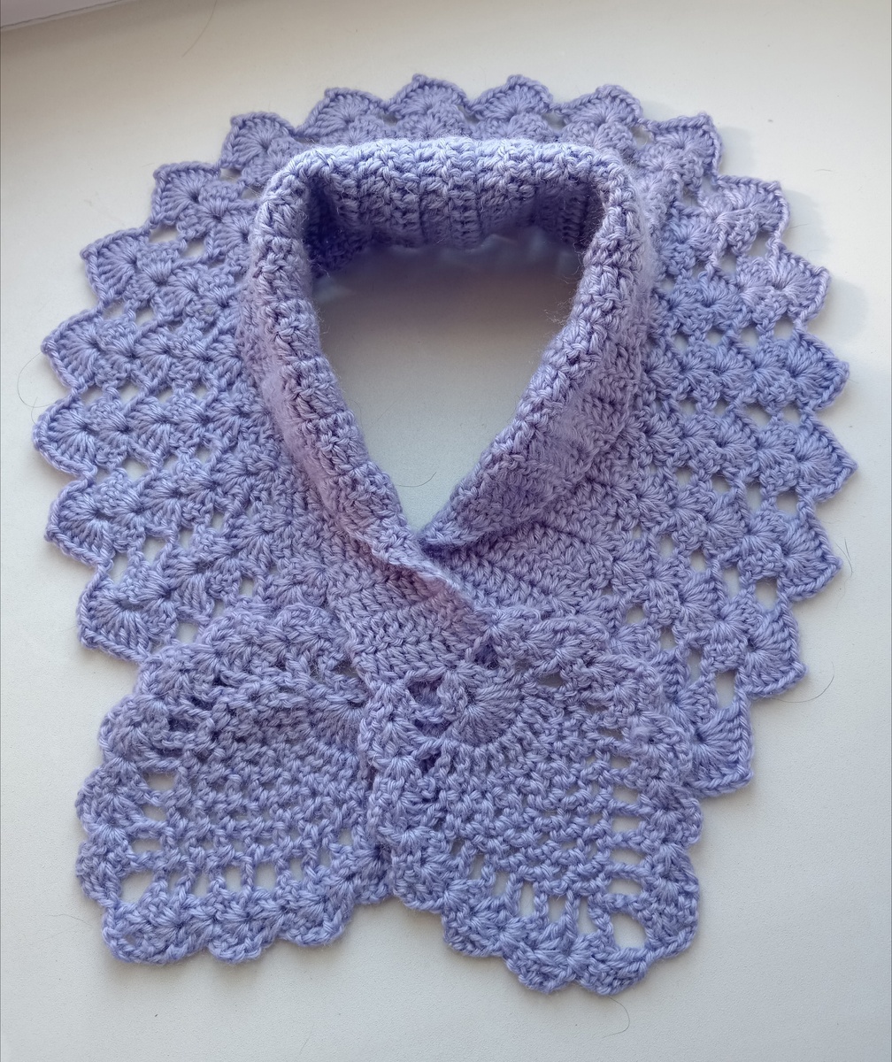 Шарф-воротник связан по МК Натальи Рогатовской. Подобных МК в интернете можно найти несколько, но МК Натальи понравился больше всего: без лишних рассуждений, каждое действие показано попетельно и подробно. От себя добавила только пару рядов обвязки (веерочки вдоль края шарфа) и не стала делать пико в последнем ряду обвязки, так как моя пряжа толстовата для этого элемента. Пряжа Lana Gatto Calico 50г/113м цвет 2522 сиреневый