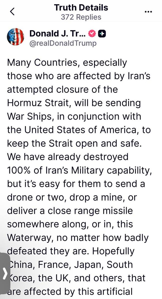 Трамп в Truth Social: Многие страны, особенно те, на которые повлияла попытка Ирана перекрыть Ормузский пролив, направят военные корабли