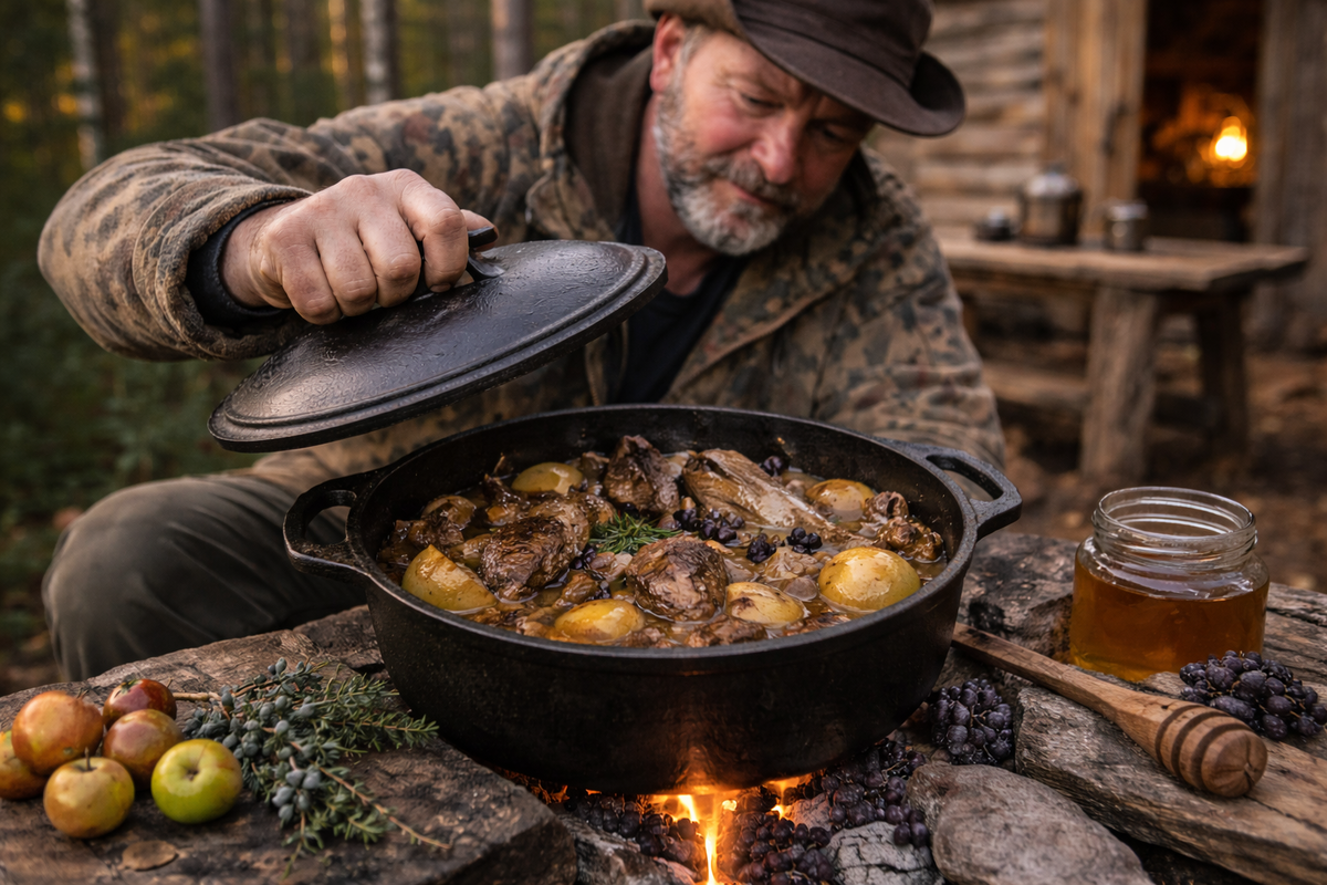 Ингредиенты: 1 дикий гусь (примерно 1,5–2 кг), 3–4 кислых лесных яблока, 2 крупные луковицы, 4 зубчика чеснока, 10–12 ягод можжевельника, 2 столовые ложки мёда, 2 столовые ложки растительного масла, 1 лавровый лист, соль, чёрный перец, около 400 мл воды или бульона. Шаг 1. Тушку дикого гуся хорошо промойте холодной водой и обсушите. Разрежьте птицу на крупные куски — грудку, бёдра и крылья. Шаг 2. Если гусь старый, замочите мясо на 2–3 часа в холодной воде или слабом солевом растворе — так мясо станет мягче. Шаг 3. Яблоки разрежьте на крупные дольки, сердцевину удалите. Лук нарежьте толстыми полукольцами, чеснок раздавите ножом. Шаг 4. Ягоды можжевельника слегка раздавите ножом или ступкой — так они лучше раскроют аромат. Шаг 5. В чугунке или глубокой сковороде разогрейте растительное масло. Выложите куски гуся и обжаривайте их на сильном огне 8–10 минут до румяной корочки. Шаг 6. Добавьте лук и чеснок, перемешайте и готовьте ещё около 5 минут, пока лук не станет золотистым. Шаг 7. Пол