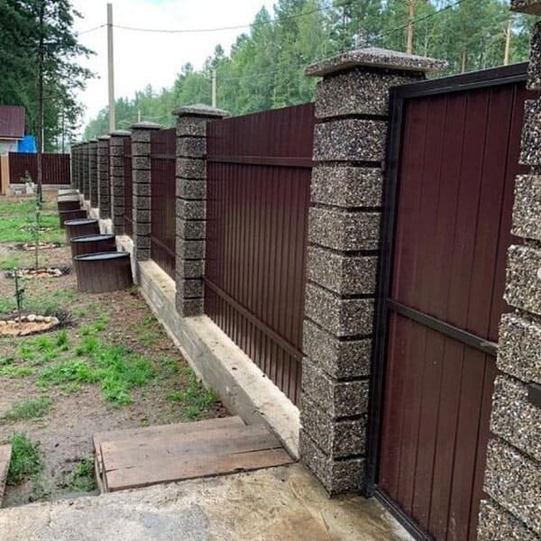 В зависимости от проекта забор может быть полностью бетонным или комбинированным — например, с металлическими или деревянными секциями между столбами.