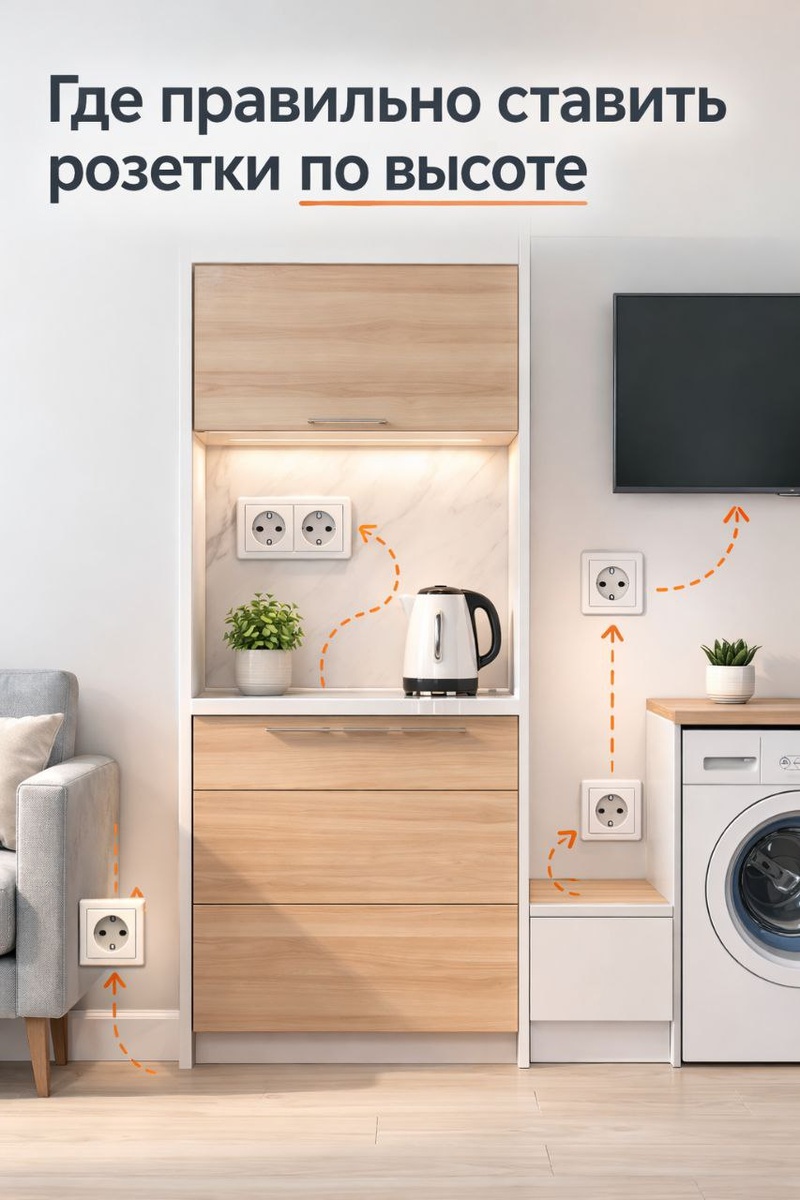 Один из частых вопросов при монтаже — на какой высоте устанавливать розетки. Строгого единого стандарта нет, но есть удобная и проверенная практика. Основные высоты 🔹 Розетки в комнатах Обычно делают 25–30 см от чистого пола. Это удобно и розетки не бросаются в глаза. 🔹 Розетки на кухне (рабочая зона) Ставят 100–110 см от пола или 10–15 см над столешницей. 🔹 Для телевизора Обычно 120–140 см от пола за телевизором. 🔹 Для стиральной машины / посудомойки Розетка ставится рядом или в соседнем шкафу, но не прямо за техникой. Частые ошибки ❌ розетки слишком низко возле плинтуса ❌ розетка прямо за техникой ❌ нет запаса по количеству Итог Лучше заранее распланировать розетки под мебель и технику, чтобы потом не пользоваться удлинителями. ⚡ Вопросы и сотрудничество: Telegram: @help_electrik WhatsApp: +7 967 110-14-11 🌐 https://electrik-clge.vercel.app/
