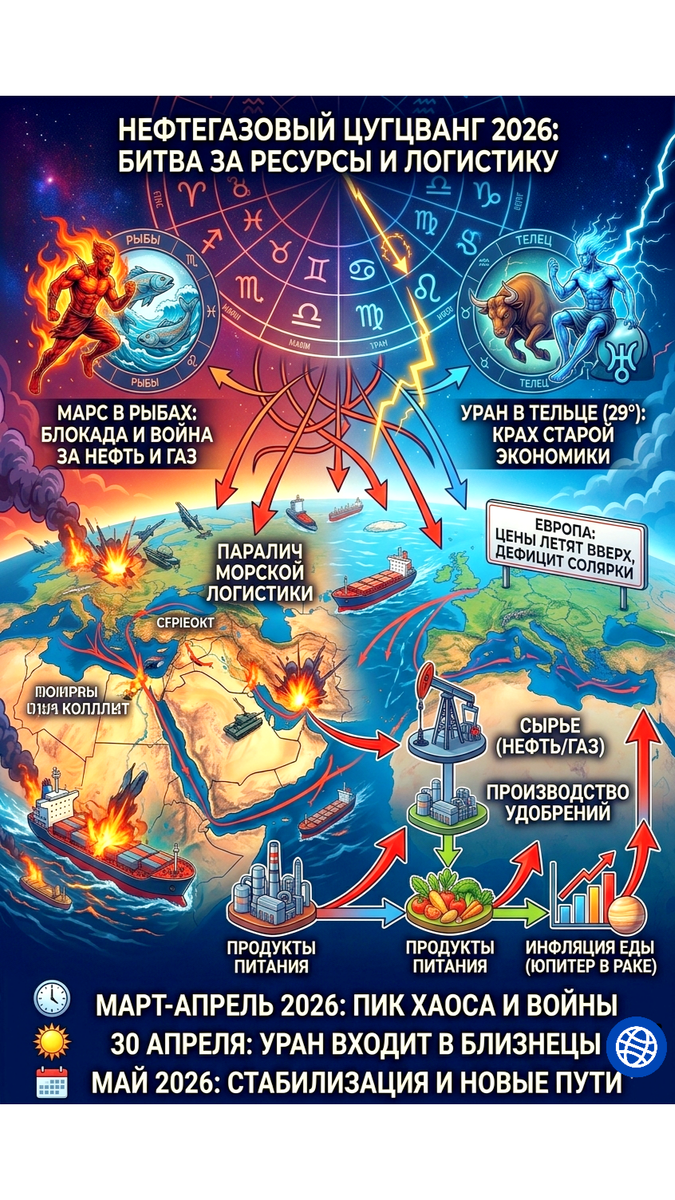 Марс в Рыбах (2 марта – 9 апреля): Марс — планета войны и действия. Рыбы управляют нефтью, газом, химией и мореплаванием. Вход Марса в этот знак означает прямую битву за ресурсы и контроль над критическими морскими узлами (Ормузский пролив, Красное море). Девиз периода: «Забрать ресурсы любой ценой».