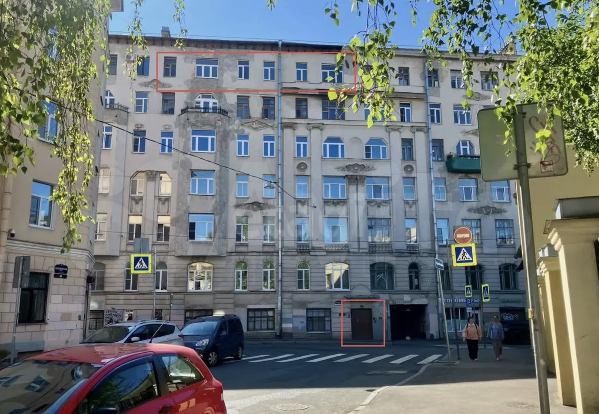 Интересной особенностью здания являются окна — они довольно разнообразны по форме и размеру, что добавляет фасаду индивидуальности. При этом внутри парадная выглядит очень аутентично: всё соответствует духу старого фонда, но при этом здесь есть важный бонус — лифт. И с учётом того, что квартира находится на седьмом этаже, это преимущество сложно переоценить.